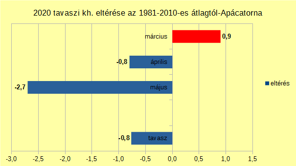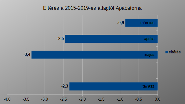 2020 tavasza Apácatornára is az átlagosnál lényegesen hűvösebb időjárást hozott. A tél legalacsonyabb hőmérsékletét, -8,7°C-ot április 2-án hajnalban mértem. A hideg időben jelentős fagykárok keletkeztek, az őszibarack >90%-a, a szilva jelentős része, a kajszi 100%-a és a körte zöme is lefagyott. Összesen 32 alkalommal csökkent fagypont alá a hőmérséklet, ami 17 nappal több az éghajlati normánál. -5°C alatti minimumhőmérséklet összesen 11 nap fordult elő, téli nap viszont idén tavasszal nem jelentkezett(átlag:1). 7 nyári napban is részünk volt, ami 3-mal kevesebb a megszokottnál. Hőségnap szintén nem fordult elő.