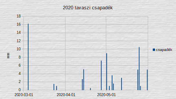 2020 tavaszán a megszokottnál lényegesen kevesebb csapadék hullott, a szokásos ~60%-a. A jelzőnapok is egy száraz tavasz képét rajzolják ki: csapadékos nap összesen 16 adódott a megszokott 26 helyett, havas napból 2 fordult elő, ami 2-vel kevesebb a megszokottnál. Napi 5 mm-t meghaladó összeg 7 alkalommal gyűlt össze.(átlag:9) Zivataros nap mindössze egy fordult elő a szokásos 4 helyett.
