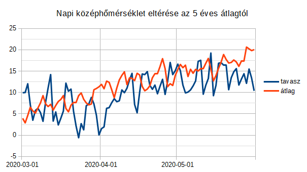 Az első két ábra a tavaszi hónapok középhőmérsékletének anomáliáját jelzik az országos 30 éves-, és az ajkai 5 éves átlaghoz viszonyítva